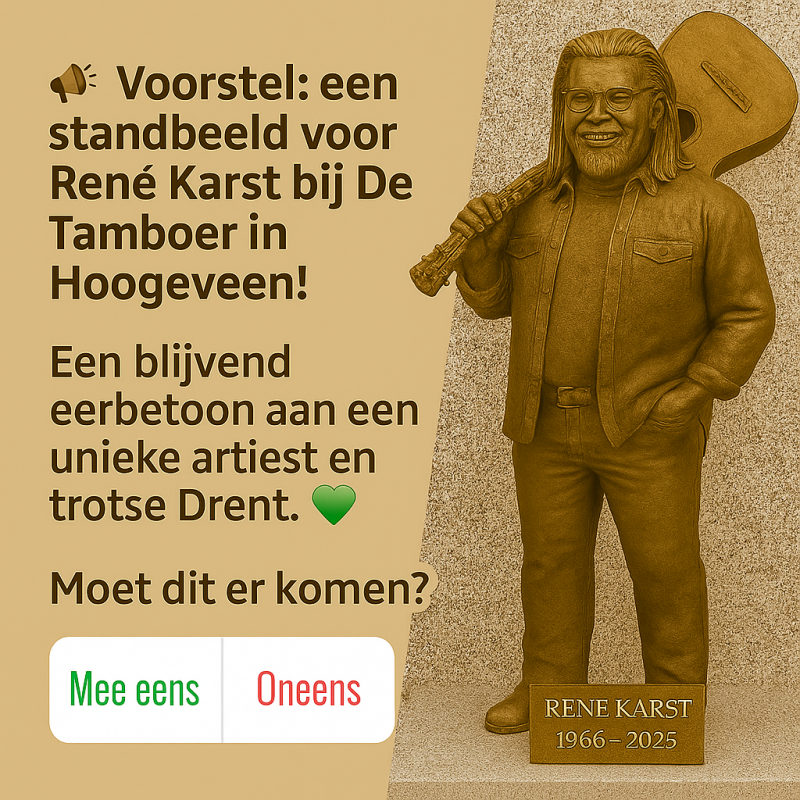 Omdat deze bijzondere Drentse artiest nooit vergeten mag worden. Wij vinden dat René Karst een standbeeld verdient. Onderteken de petitie en help ons om dit te realiseren. Deze man was bijzonder en een belangrijk persoon binnen de gemeente Hoogeveen.